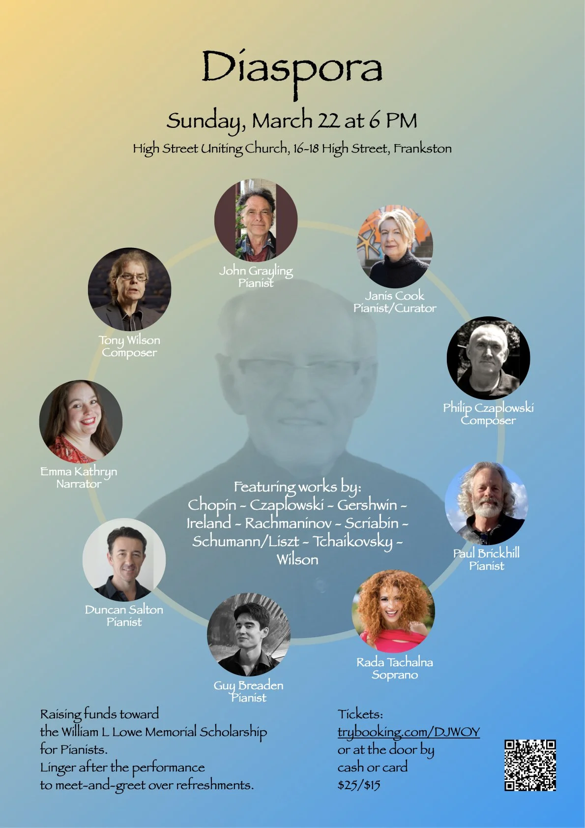 Bill Lowe was John Grayling’s piano teacher for about eight years before tertiary studies at the Victorian College of the Arts (VCA). There, John had three years of classes with Stephen McIntyre. After a period of parenting and teaching, John commenced 30 years as a repetiteur at the VCA School of Dance, performing much music from the solo repertoire for dance performances by leading Australian choreographers. In 1991, John was the repetiteur and solo pianist for Nureyev’s last Australian tour. As a freelance pianist, John has played much chamber music, the occasional solo recital, and several favourite concertos with amateur orchestras: works by MacDowell, Beethoven (4 & 5), Brahms, and Grieg, to name a few.
